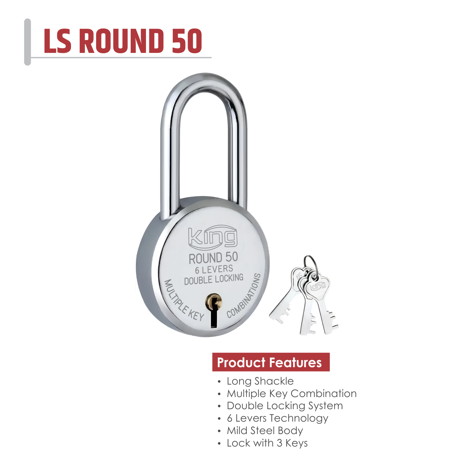 5) Mild Steel Body :- The mild steel body adds to the lock’s overall durability, offering solid physical protection and impact resistance while maintaining a practical, cost-effective design.